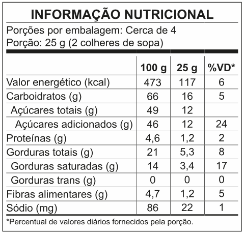 Ovomaltine (açúcar, extrato de cereal (cevada e malte), glucose, cacau em pó, fosfato tricálcico, sal, canela, emulsificante lecitina de soja, regulador de acidez carbonato de sódio e aromatizante), açúcar, massa de cacau, leite em pó integral, gordura vegetal, manteiga de cacau, emulsificantes goma arábica, lecitina de soja e poliglicerol polirricinoleato, glaceante talco e aromatizante. CONTÉM GLÚTEN. CONTÉM LACTOSE. ALÉRGICOS: CONTÉM CEVADA E DERIVADOS, DERIVADOS DE LEITE E DE SOJA. PODE CONTER AMENDOIM, AVEIA, CENTEIO E TRIGO.